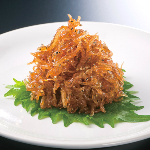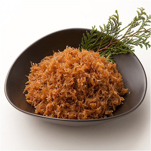 Chirimen tsukudani is prepared by slowly simmering baby sardines in soy sauce, mirin, sake, and sugar. The liquid is cooked down until fully absorbed. This simple method locks in the flavors and conserves the nutritional value of the food naturally. Rich in calcium, protein and iron. Deliciously crunchy and addicting, you can also enjoy it as a topping on rice, tofu, or just as a simple snack with sake!
