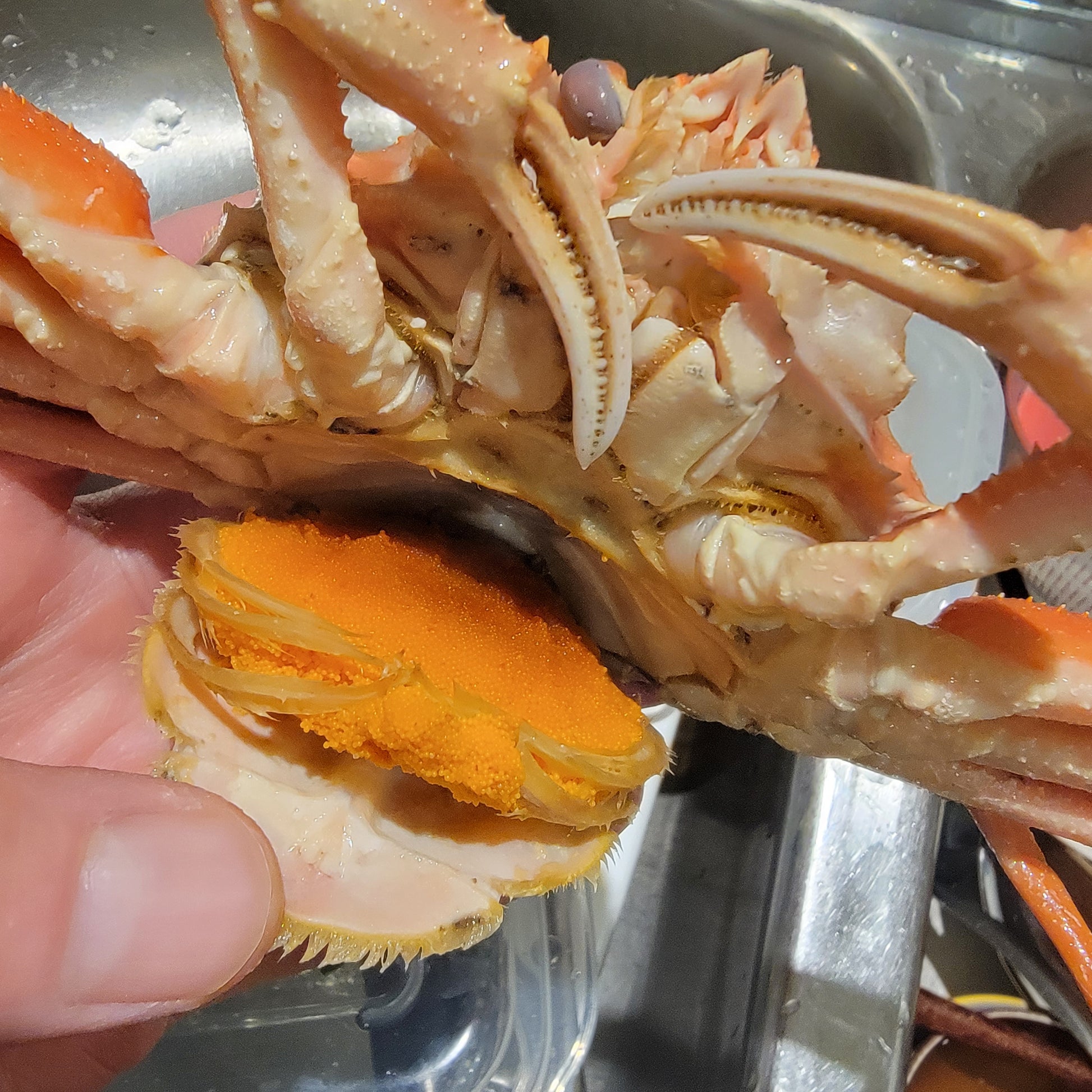 Snow crabs name are divided into male and female in Japan. Female snow crabs are called "Seko Gani". Unlike male snow crabs, Seko Gani are smaller but prized for their unique flavor, which comes from their rich roe (uchiko), and internal eggs (sotoko). The roe adds a creamy, slightly briny taste, making Seko Gani a delicacy distinct from the sweeter male crabs.