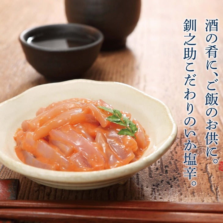 北海道で獲れた新鮮ないかを使用した、釧之助のいか塩辛釧路港。塩辛特有の生臭さを極力抑えた味わいで塩分も控えめです。ご飯のお供として、酒の肴としておすすめできる逸品です。また、身の厚いいかを厳選して使っておりますので、食べ応えにもきっとご満足いただける仕上がりとなっております。